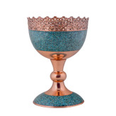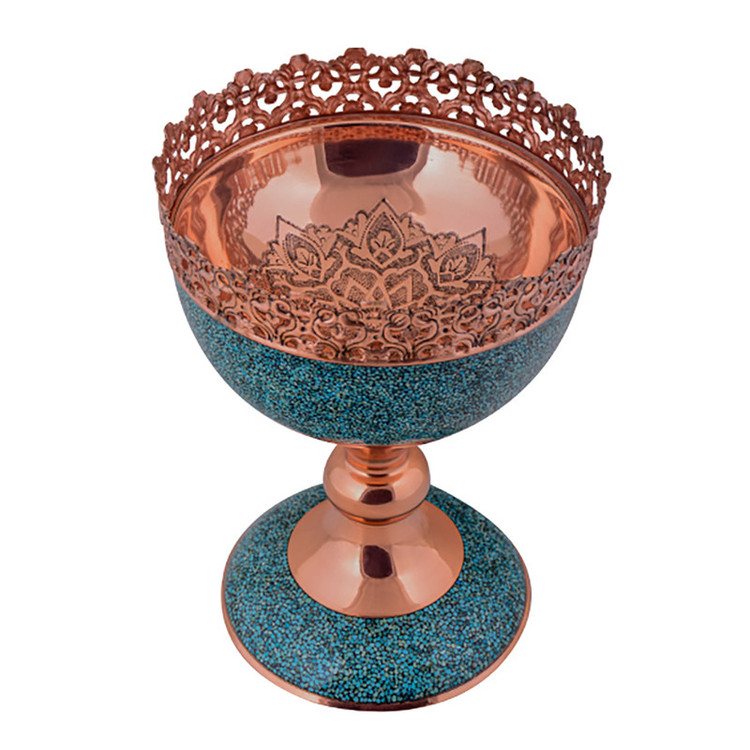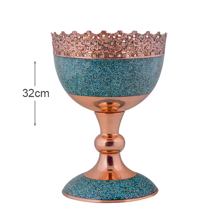 فیروزه یک سنگ کمیاب و ارزشمند به رنگهای طیف فیروزهای و از رده فسفات آبدار طبیعی آلومینیوم است. این سنگ ارزشمند در نیشابور یافت میشود. معدن فیروزه نیشابور از قدیمیترین معادن فیروزه جهان است که از 2000 سال پیش از آن سنگ فیروزه استخراج میشده و در شمال غرب نیشابور قرار دارد. سنگ فیروزه نیشابور مرغوبترین و گرانبهاترین سنگ فیروزه در جهان شناخته شده است. فیروزه کوبی این آجیل خوری با استفاده از سنگ های با اصالت و شناسنامه دار نیشابور صورت گرفته است. این اثر امضا دار را میتوان از بهترین فروشگاه صنایع دستی تهییه کرد. آجیل خوری فیروزه کوب برای کسانی که قصد خرید صنایع دستی امضا دار را دارند،یک محصول منحصر به فرد است. تمامیه محصولات فیروزه کوبی دارای امضا استاد آقاجانی میباشد،فیروزه کوب ها اصالت سنگ نیشابور دارد که بهمراه شناسنامه ارائه میشود. محصولات فیروزه کوب از ضمانت نامه ویژه بر خوردار است که دارای 10 سال ضمانت فیروزه کوبی بصورت تعویضی قرار گرفته است. ارتفاع این آجیل خوری فیروزه کوب 30 سانتی متر است که بدنه مسی آن تماما از فلز مس خالص و درجه یک تهیه شده است. سه لایه پوشش داده شده است.